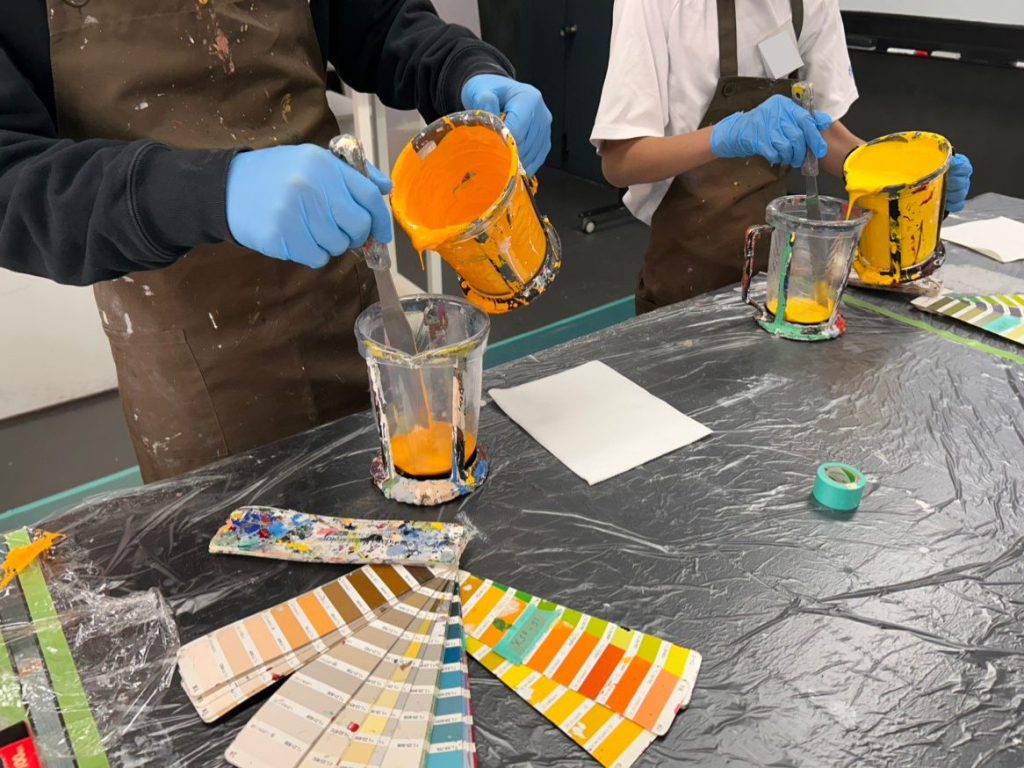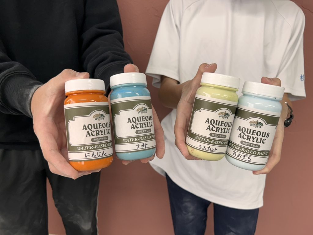 今回の職場体験では、色づくりから商品の形にする作業、そして最終的にお客様が使う場面まで、塗料の一連の流れを体験してもらいました。