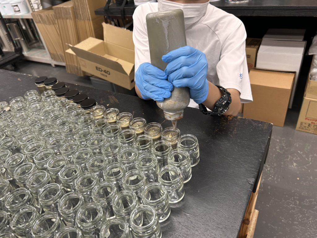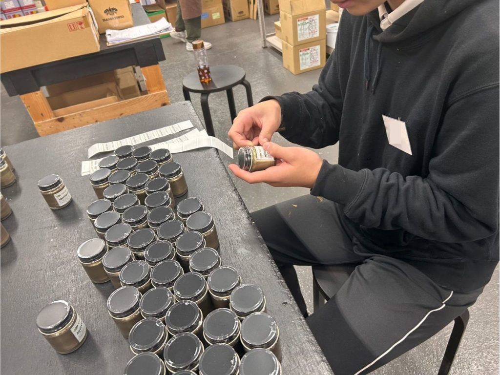 2日目の午前中は、出荷チームで塗料の小分作業を体験。容器に塗料を注ぎ、ラベルを貼り、出荷準備が整うまでの工程を一通り経験しました。