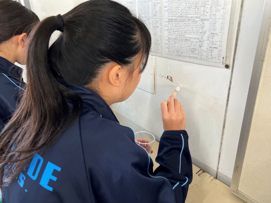 荷物の擦れ跡や手の跡が残っていた箇所を、生徒が自分で塗料を塗って補修する工程を体験しました。