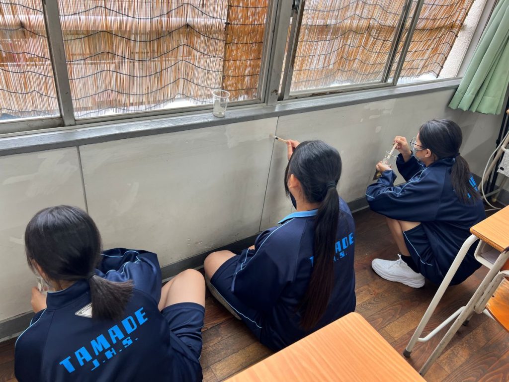完成した塗料は、その場で教室の壁のタッチアップに使用しました。