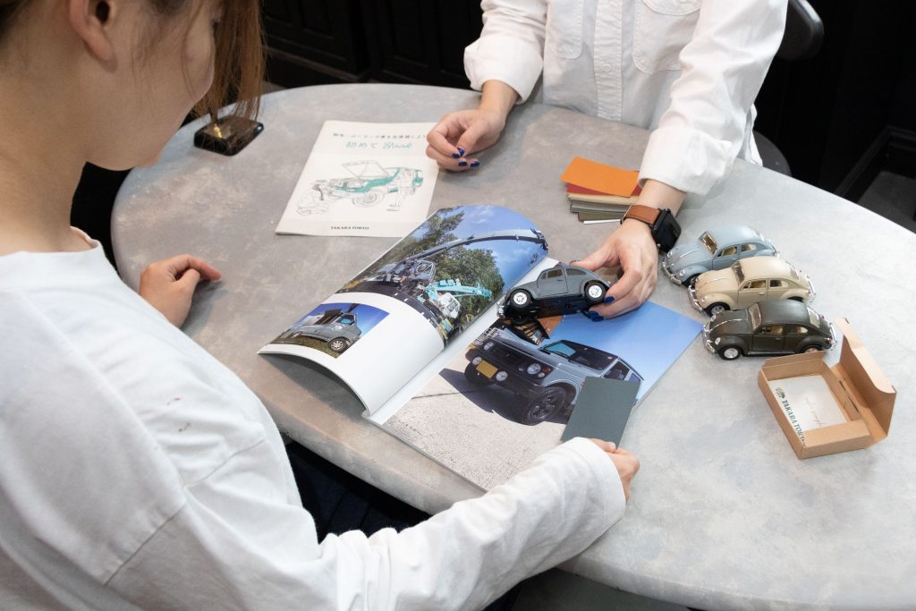 ・スタッフが1色ずつ手で塗った実際の色、塗膜を確認できる