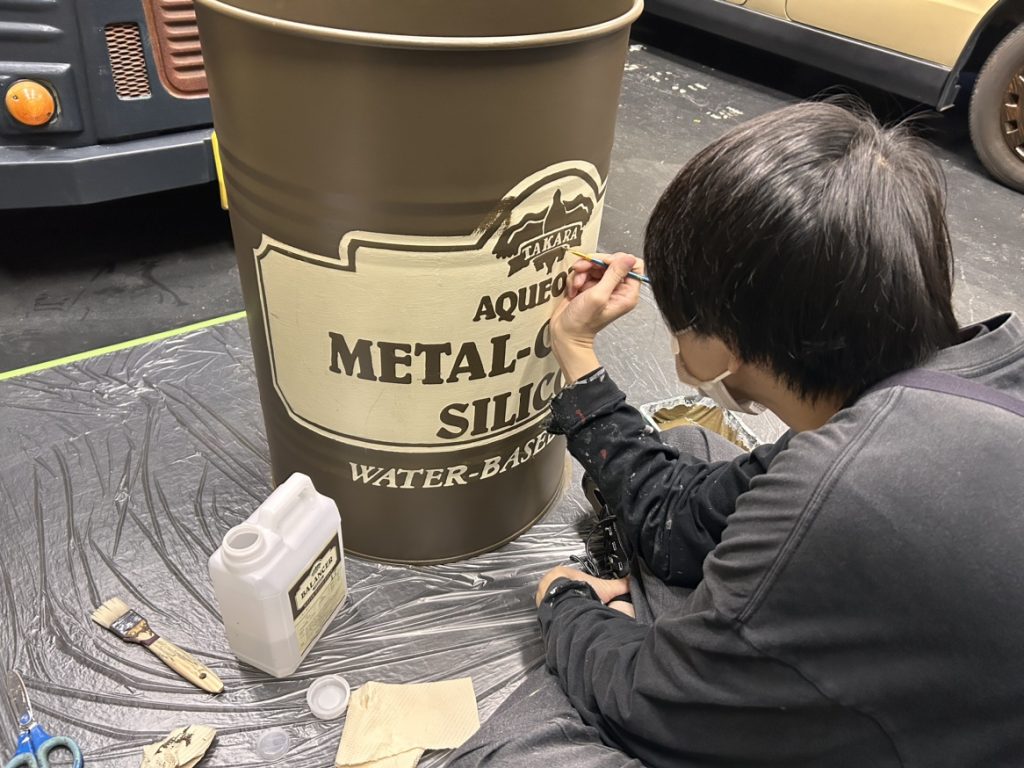 スタッフが刷毛とローラーでDIY全塗装した車を2台展示します。